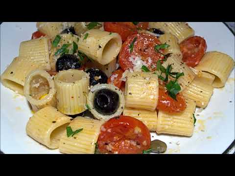 Mezze maniche ai pomodorini capperi e olive con Pina